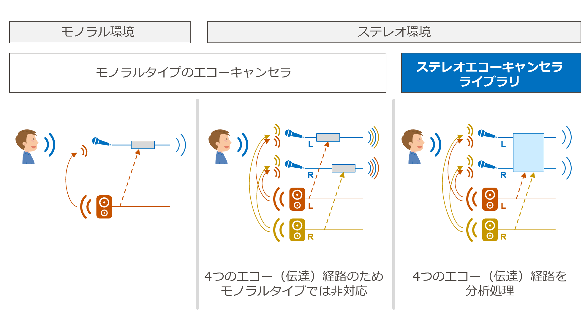 ステレオ環境(マイクとスピーカーそれぞれ2つ)で発生する4つのエコー(伝達)経路を分析処理してエコーを消去するとともに、デジタル信号処理の最適化による広帯域化により、高い臨場感を実現しました。