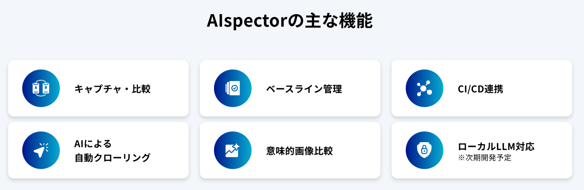 *1:「AIspector」は、AIとInspector(監察官)を組み合わせた造語で、AIを活用して人間が見逃してしまうような画面差分もチェックする堅牢さを兼ね備えたシステムです。